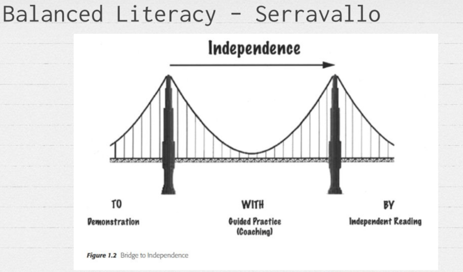 Đọc (Reading): gồm có Giáo viên kể chuyện (Modeled read aloud), Giáo viên nói ra cách mình suy nghĩ (Modeled think aloud), Giờ tự tập đọc (Independent reading), Hướng dẫn đọc theo nhóm (Guided reading), Đọc cùng nhau (Shared reading).