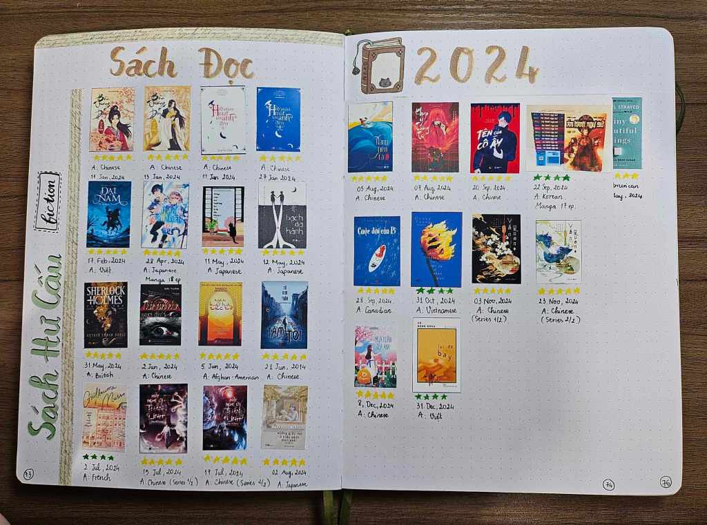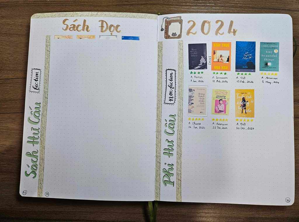 Năm 2024 mình cũng làm mục tiêu là 60 cuốn, nhưng không đạt KPI. Dù vậy, mình đọc nhiều hơn, truyện hay sách cũng dày hơn. Mình viết cũng nhiều hơn. Và cũng cố gắng đọc 7 cuốn sách Phi Hư Cấu. Thể loại này đọc rất mất thời gian, để hiểu và “học” được từ sách thì có thể mất 1 tháng cho một cuốn.